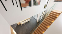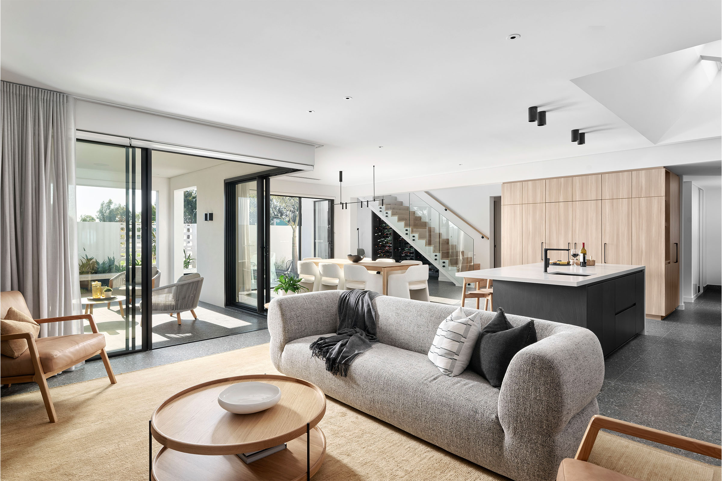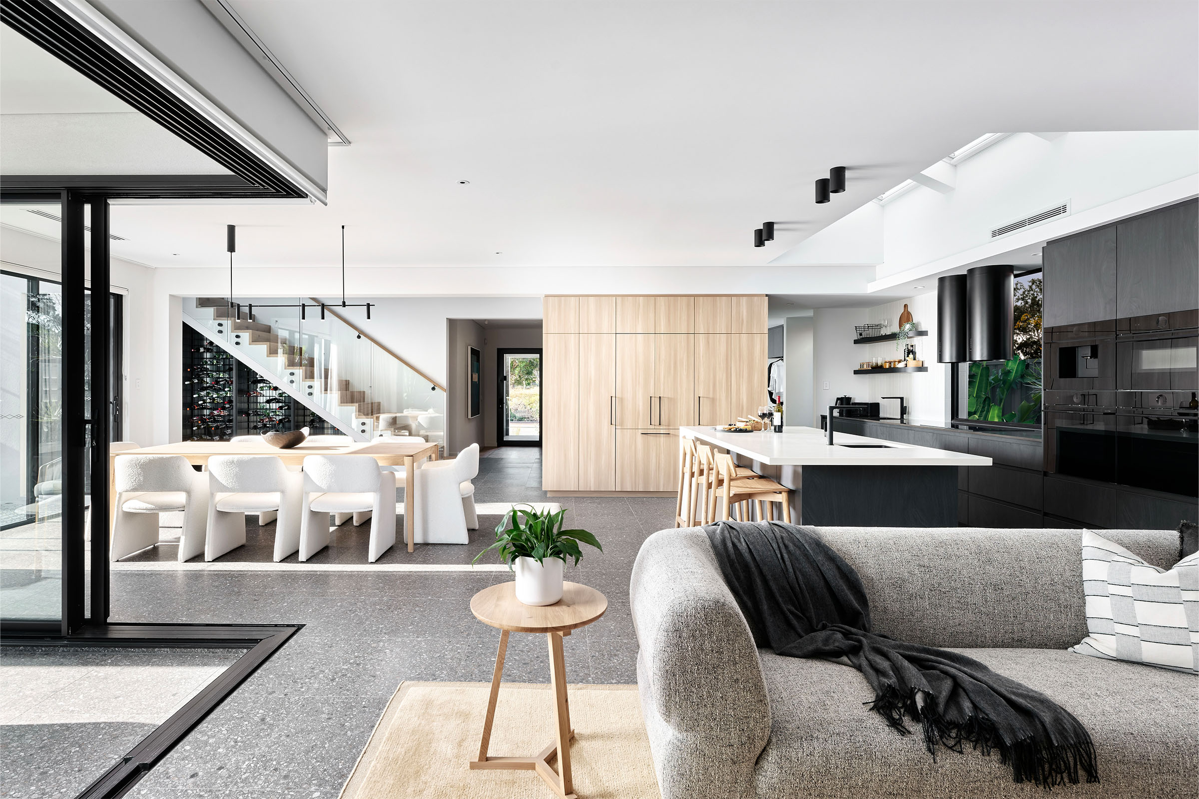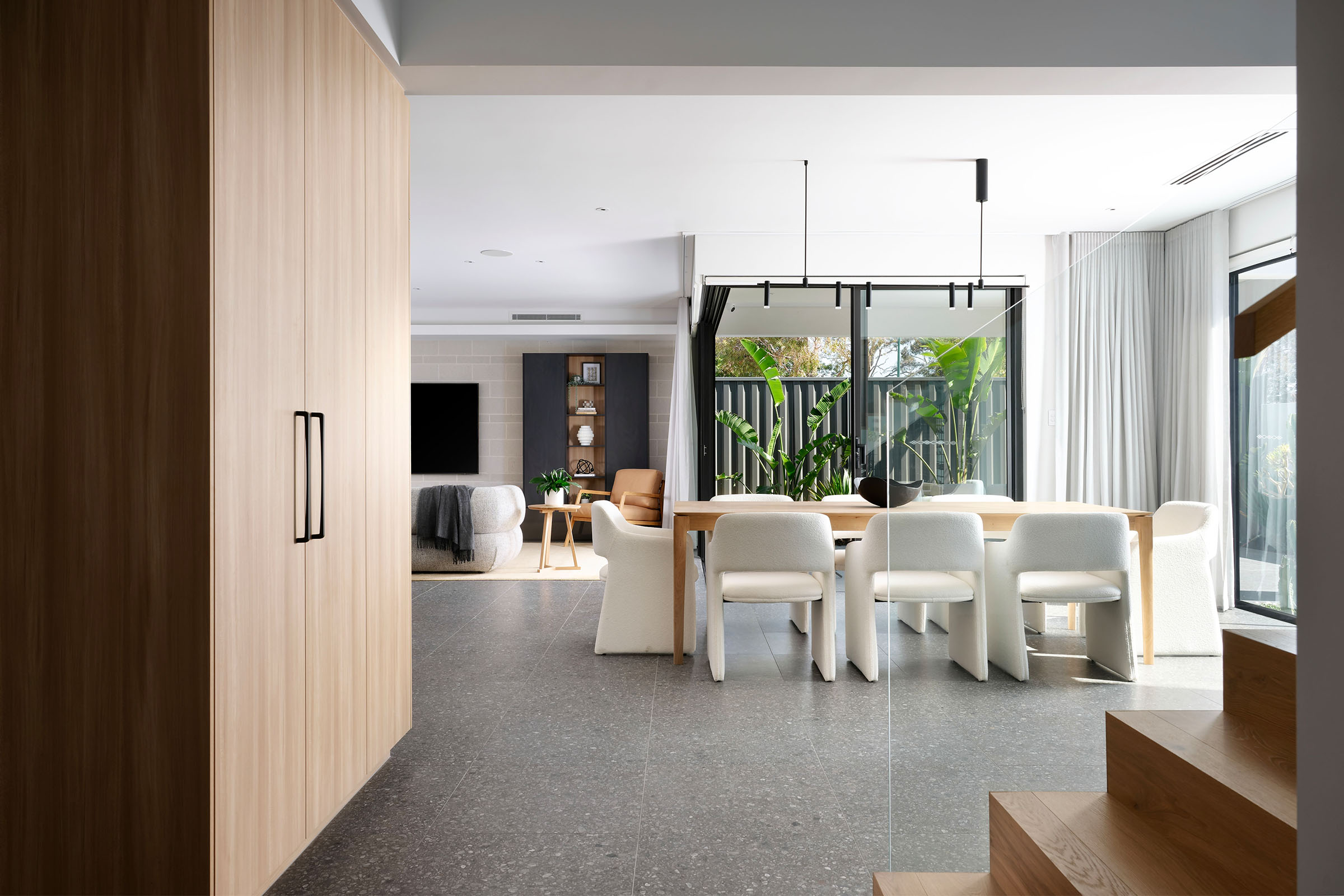 in natural light from the entry void, complemented by controlled light from vertical external Venetian blinds.