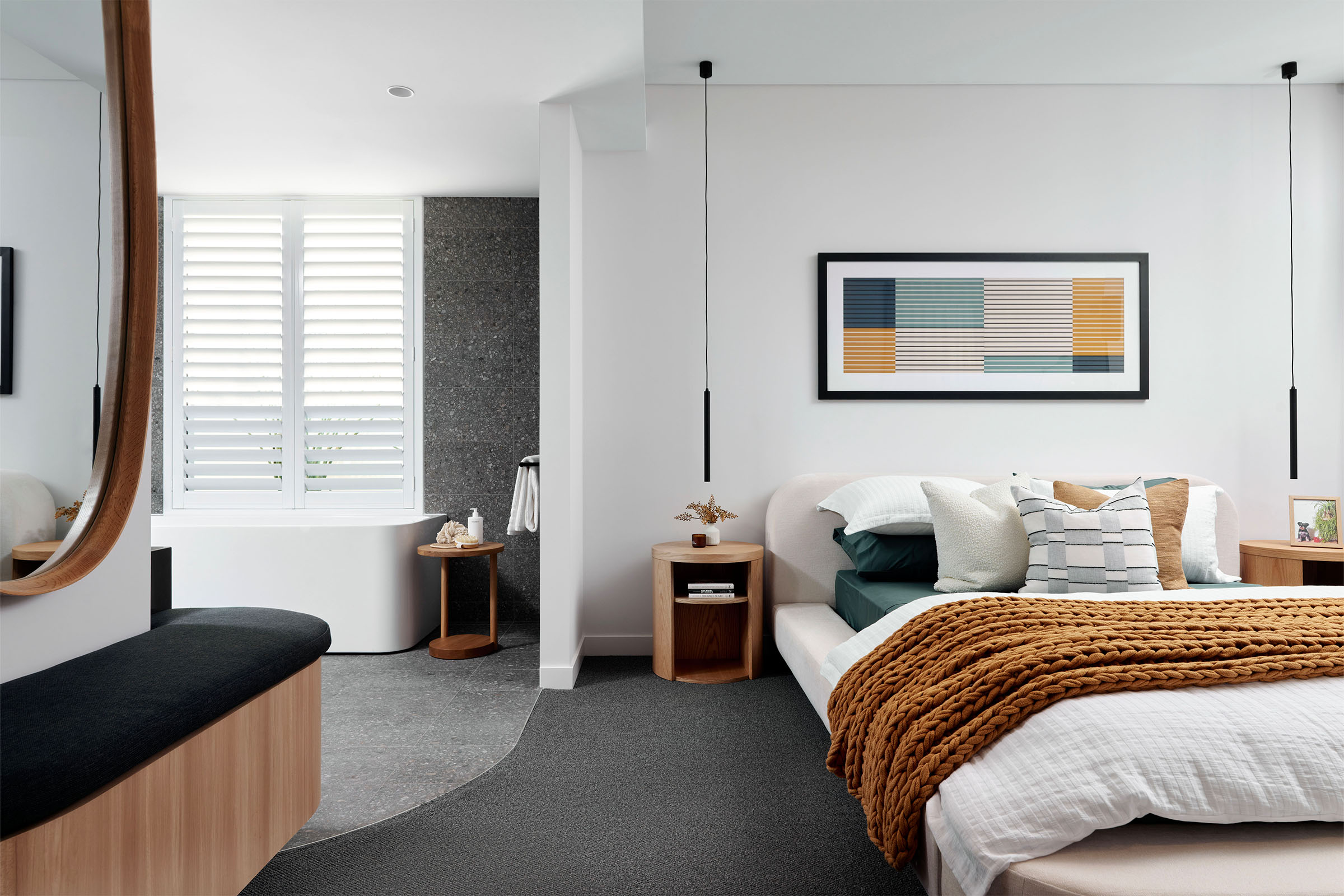 The lower floor also welcomes a unique master bedroom and ensuite with a unique walk-in robe corridor and freestanding bathtub, creating a soothing, peaceful ambiance.