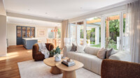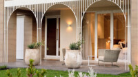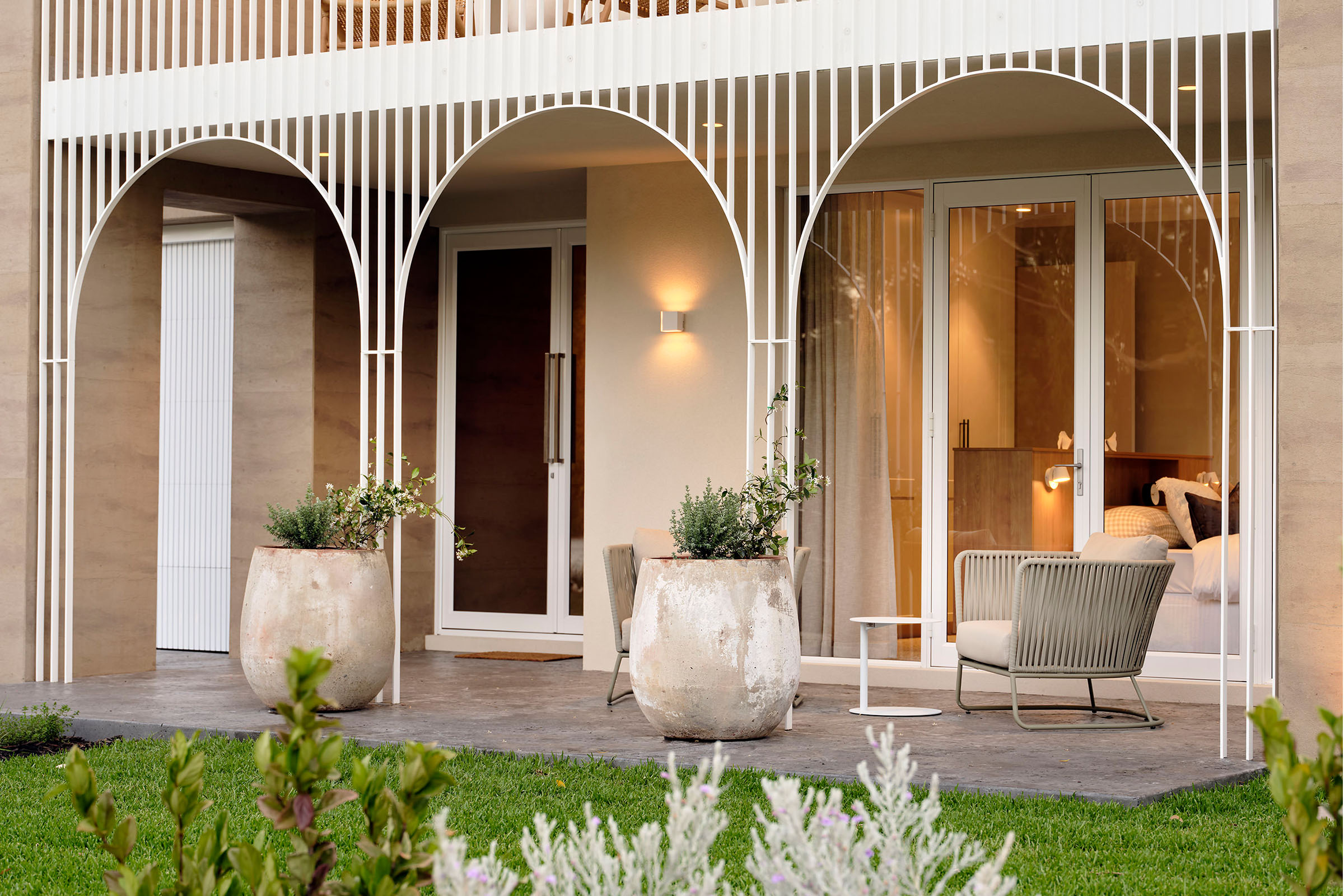 The striking elevation features large, arched openings punctuated by vertical screens, delicately echoing a timeless urban charm. Inside, the architecture is characterised by natural materials such as wood, rammed earth plaster, and earthy tones, paired with contemporary fixtures.
