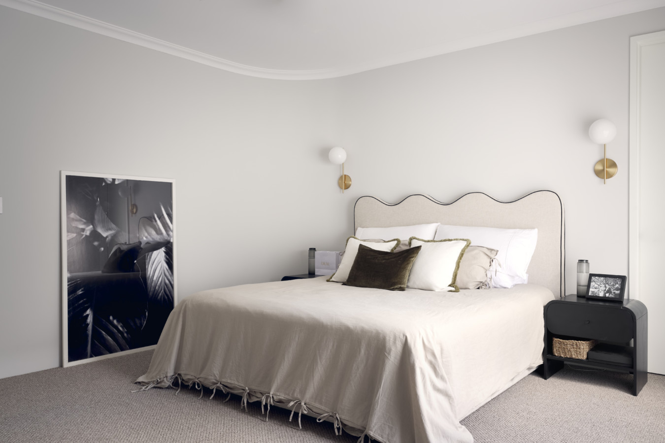 The bedroom is a true retreat, with a feature curved elevating the space and providing a unique design element. The bedframe in oatmeal linen with black velvet piping from McMullin & Co. is the perfect complement to the space, adding a touch of understated luxury to the room. The chic light fixture from West Elm completes the look.