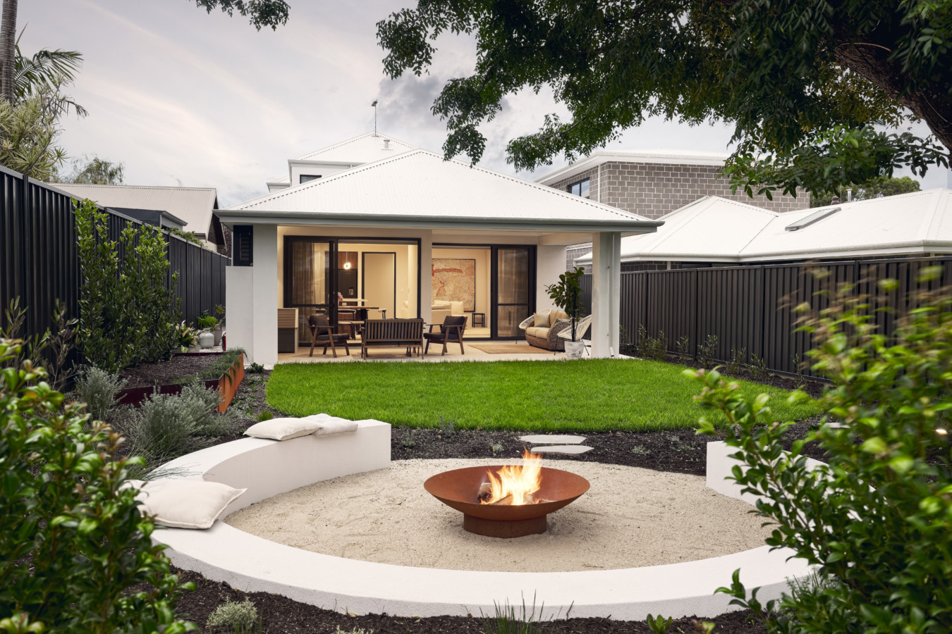 Outside, the home features a fire pit, creating a perfect spot for outdoor entertaining and relaxation.