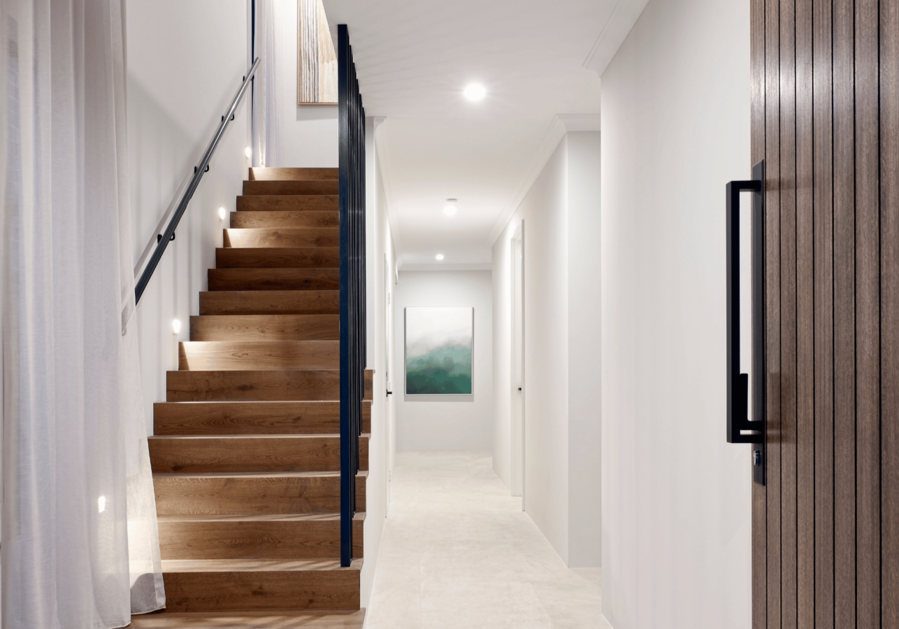 As you move further inside, you’ll be greeted by the beautiful Polytec Walnut Rojo kitchen cabinetry and Deluxe stone Frosty Carrina countertops. The kitchen opens to a spacious living and dining area, perfect for hosting guests or spending quality time with family.