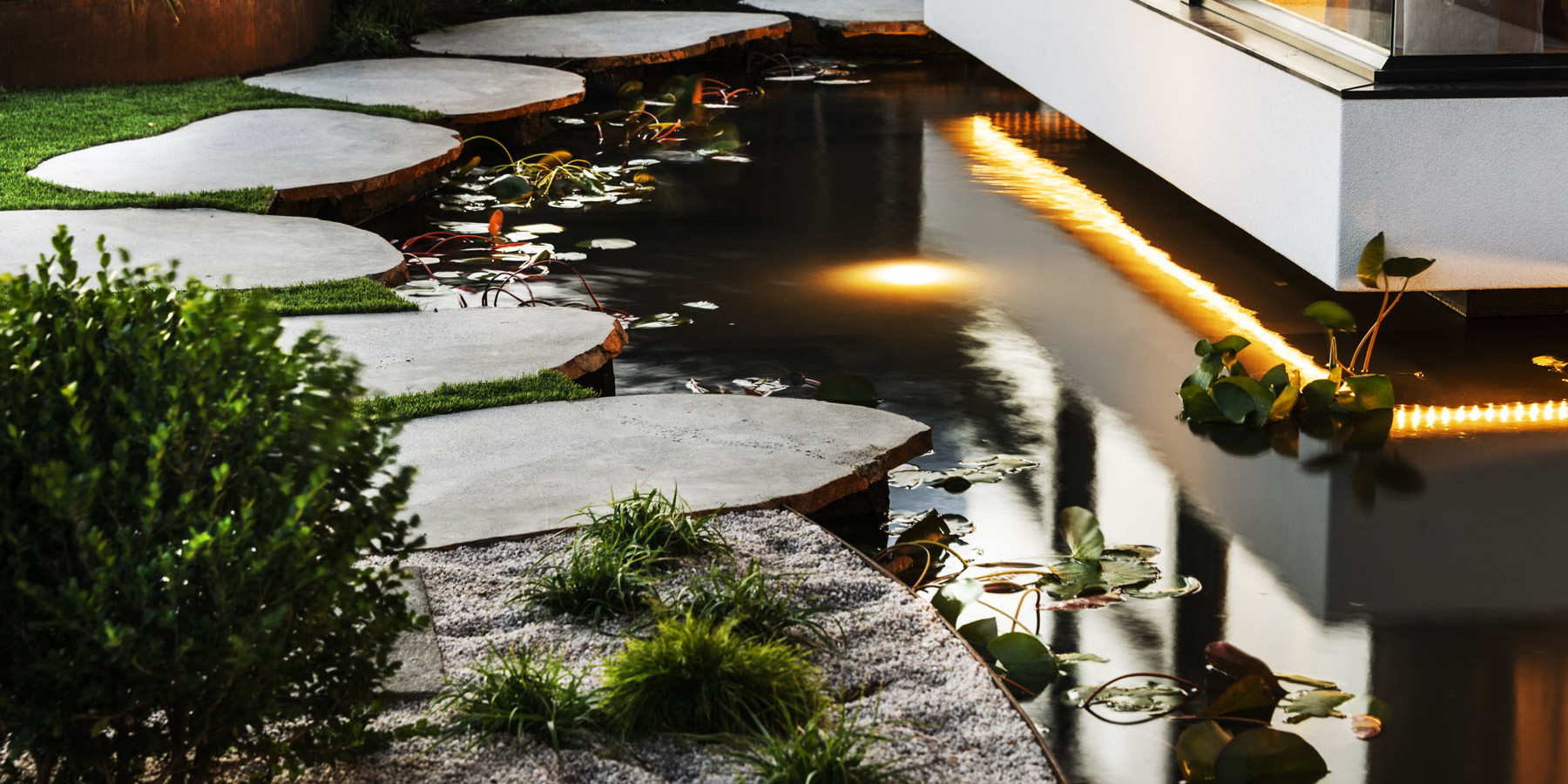Look to include an element of water in or around your home and an element of raw timber, usually in the doors or window frames.