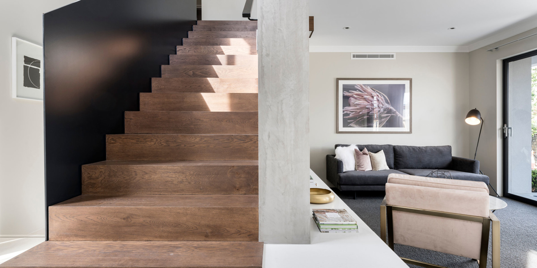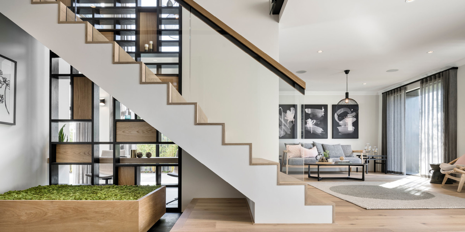 “The Kuro home design is an exploration of detail. The balustrade design features seamless floating glass and a custom designed hand rail with a feature screened wall on the conventional stair. One could say that it’s the hero of that home.”