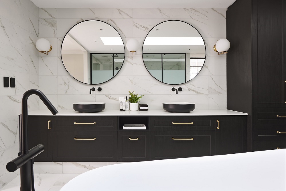 “Pick a shape and a colour and run with it throughout the bathrooms, including the accessories and small accents like handles. Be consistent throughout the home in the shape and profile of a product,”